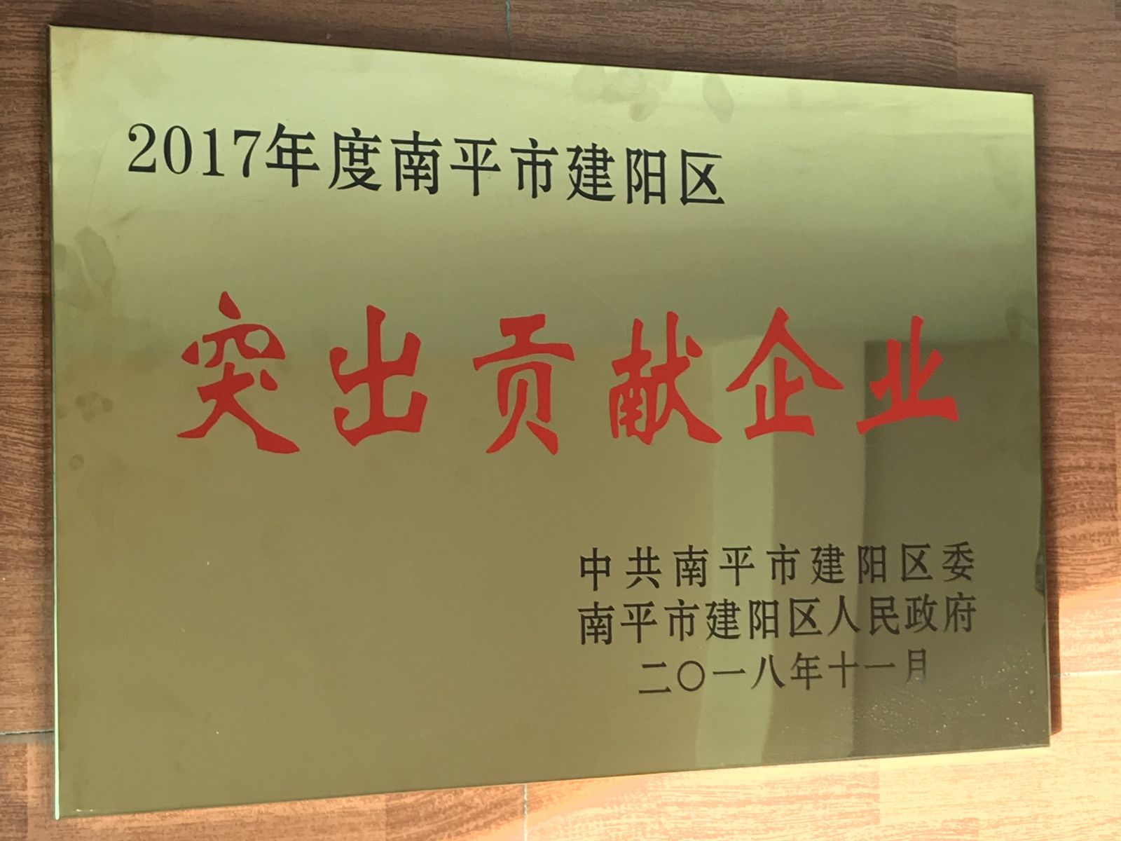 2018年11月22日下午,建陽(yáng)區(qū)召開(kāi)2018年度工業(yè)發(fā)展會(huì)議。我公司等12家企業(yè)被授予“2017年度建陽(yáng)區(qū)突出貢獻(xiàn)企業(yè)”稱號(hào),予以全區(qū)表?yè)P(yáng)并頒發(fā)牌匾。